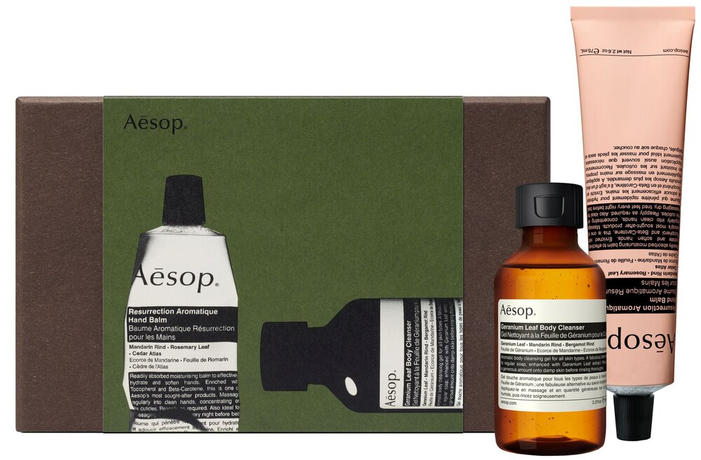 Geranium Leaf Body Cleanser osvěží a probudí unavené tělo díky aromatické vůni mandarinkové kůry a muškátových lístků, zatímco Resurrection Aromatique Hand Balm se postará o suché ruce díky směsi zklidňujících a vyživujících rostlinných výtažků, olejů a másel.