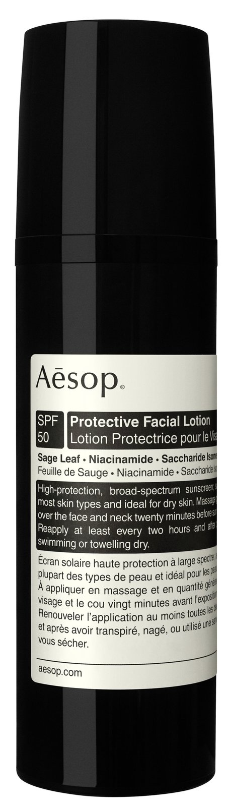 Tento krém s ochranným faktorem SPF 50 byl vytvořen ke každodennímu používání. Pokožku hydratuje, vyživuje a chrání před UVA i UVB zářením. Vhodný je pro většinu typů pleti, zejména normální, smíšenou a suchou. Protective Facial Lotion s hřejivou vůní šalvěje, levandule a cedrového dřeva obsahuje v oleji i vodě rozpustné chemické UV filtry, antioxidační vitamín E a protizánětlivý niacinamid. Po aplikaci se vstřebá a nezanechá po sobě mastný film.