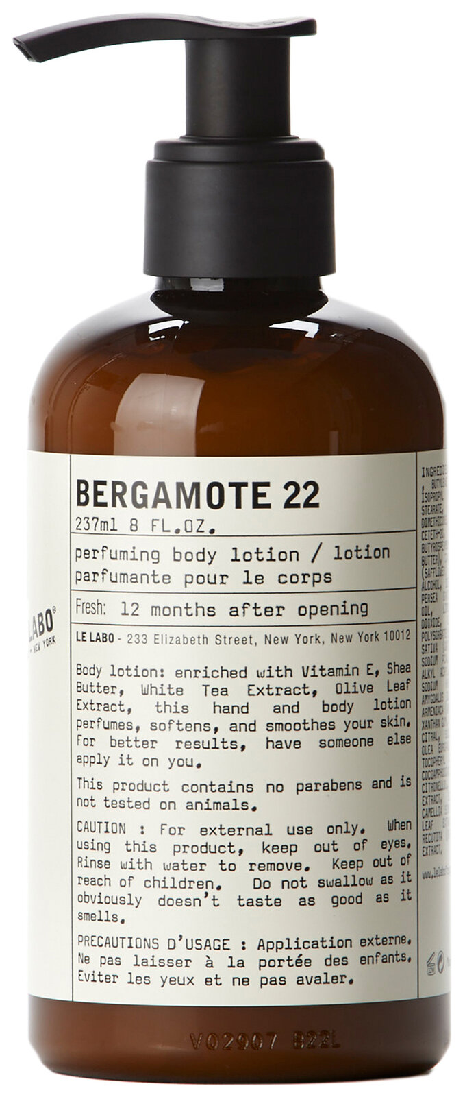 Tato lehká, ale přitom výživná emulze na tělo a ruce s vůní Bergamote 22 je obohacená o vitamíny E a A, zklidňující aloe vera a hydratační kokosový a olivový olej. Pokožku celého těla zanechá vláčnou a jemně provoněnou. Přípravek neobsahuje parabeny, je veganský a není testovaný na zvířatech.