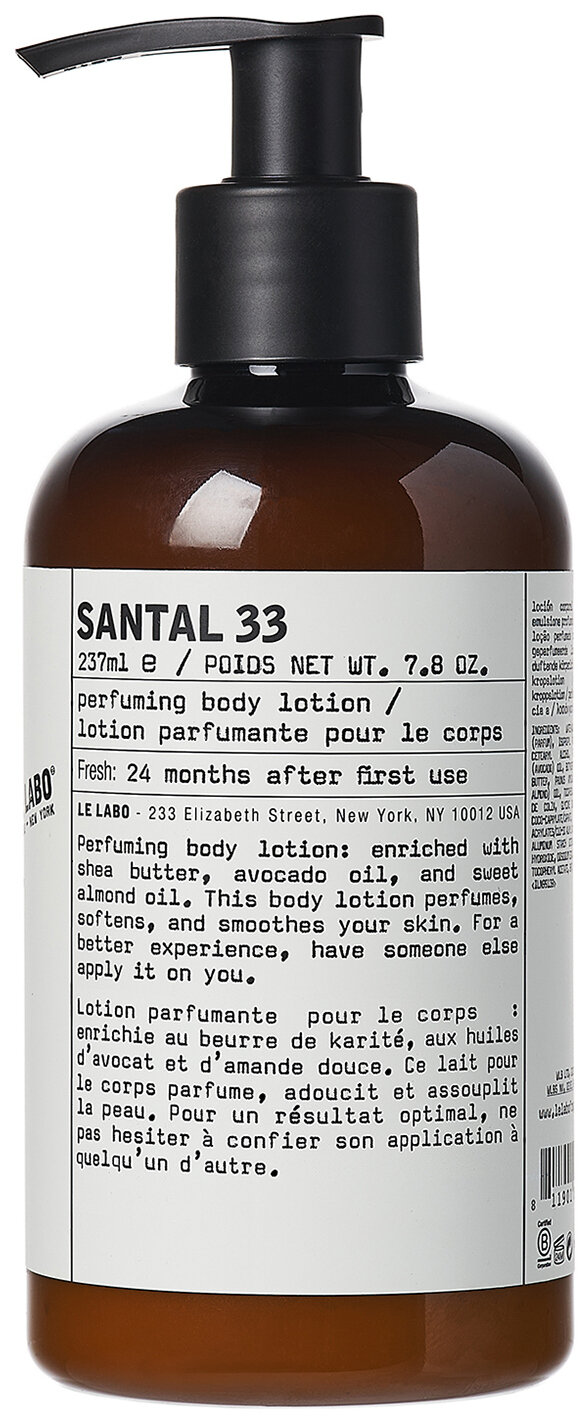 Tato lehká, ale přitom výživná emulze na tělo a ruce s vůní Santal 33 je obohacená o vitamíny E a A, zklidňující aloe vera a hydratační kokosový a olivový olej. Pokožku celého těla zanechá vláčnou a jemně provoněnou. Přípravek neobsahuje parabeny, je veganský a není testovaný na zvířatech.