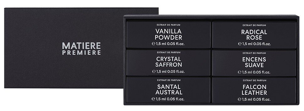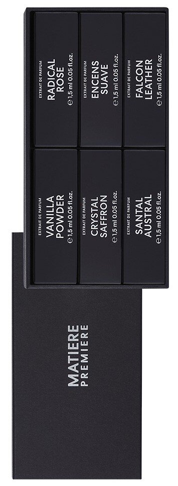 Vyzkoušejte parfémové extrakty Matiere Premiere prostřednictvím tohoto setu vzorků o objemu 1,5 ml. Set obsahuje vůně Crystal Saffron Extrait, Radical Rose Extrait, Falcon Leather Extrait, Santal Austral Extrait, Encens Suave Extrait a Vanilla Powder Extrait.